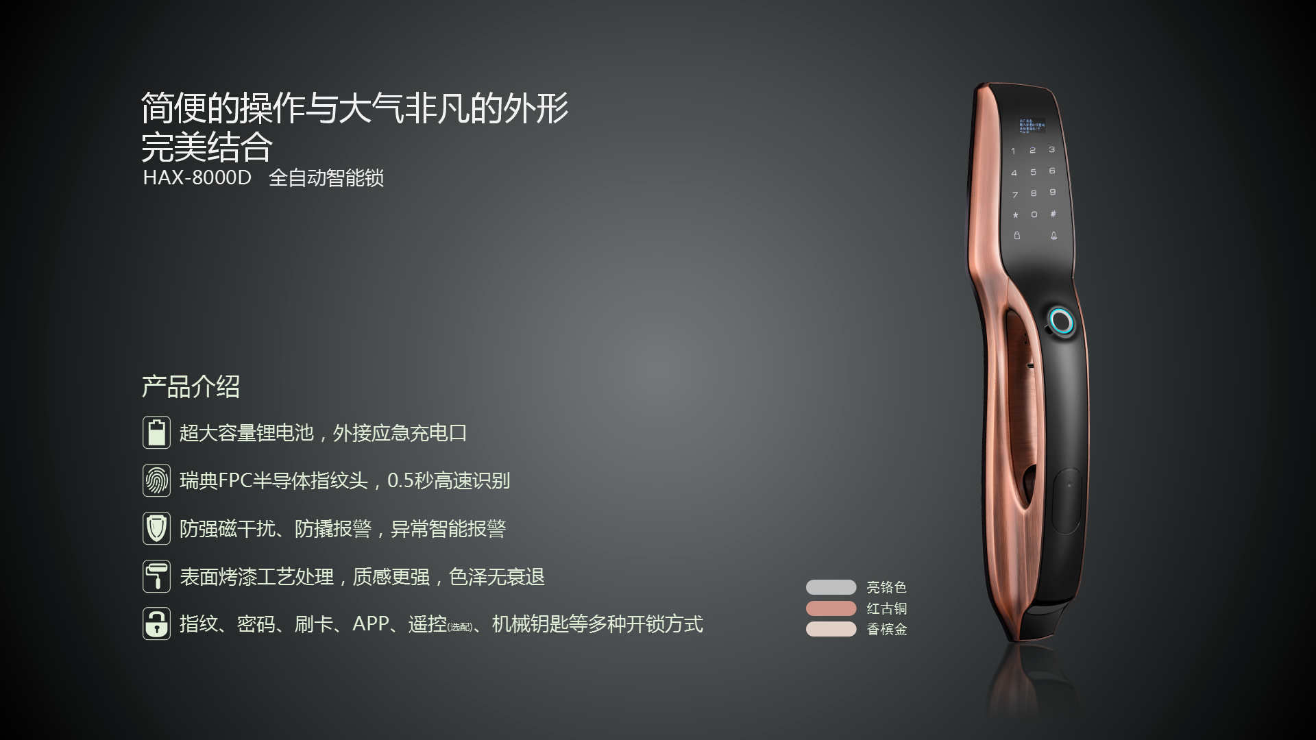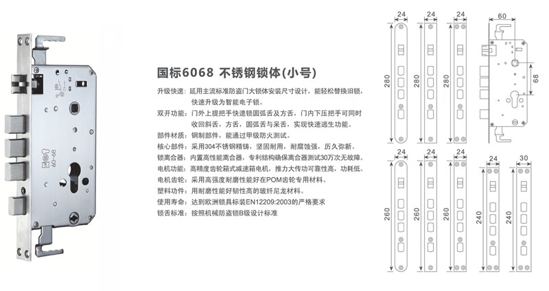 可选锁体:6068锁体(方形、圆柱形,霸王锁体) 储存配置:300组(包括指纹密码感应卡) 可选颜色:金色、黑色、亮铬 产品材质:锌合金 产品规格:410*83*64mm 密码长度:6—8位 供电方式:8.4V锂电池4600毫安 应急电源:USB DC9V 工作温